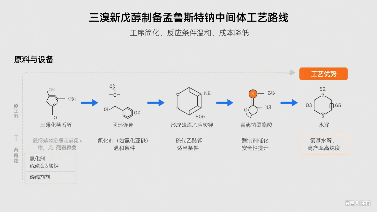 孟魯斯特鈉(Montelukast Sodium)是一種用于治 療哮 喘和過敏性鼻炎的有 效**,其中間體的制備對其** 終產(chǎn)物的質(zhì)量和生產(chǎn)成本具有重要影響。本文介紹了一種通過三溴新戊醇合成孟魯斯特鈉中間體的工藝方法。與傳統(tǒng)方法相比,該工藝具有工序簡化、反應(yīng)條件溫和、原料成本降低等優(yōu)點,為孟魯斯特鈉的工業(yè)化生產(chǎn)提供了一條高 效、經(jīng)濟(jì)的路線。